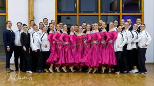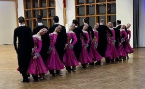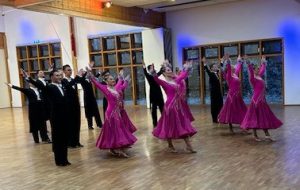 Erfreulicherweise gibt es in Darmstadt viele Interessierte am Formationstanzen, sodass die Choreografie in zwei Durchgängen präsentiert werden konnte. Den Auftakt machten die Neueinsteiger, die teilweise erst seit wenigen Monaten tanzen und gemeinsam mit einigen erfahrenen Tänzern die Fläche betraten. Für viele war es das erste Mal im Frack bzw. im Turnierkleid, mit Turnierfrisur und Make-up – ein Moment, der sicherlich mit großer Aufregung verbunden war.
